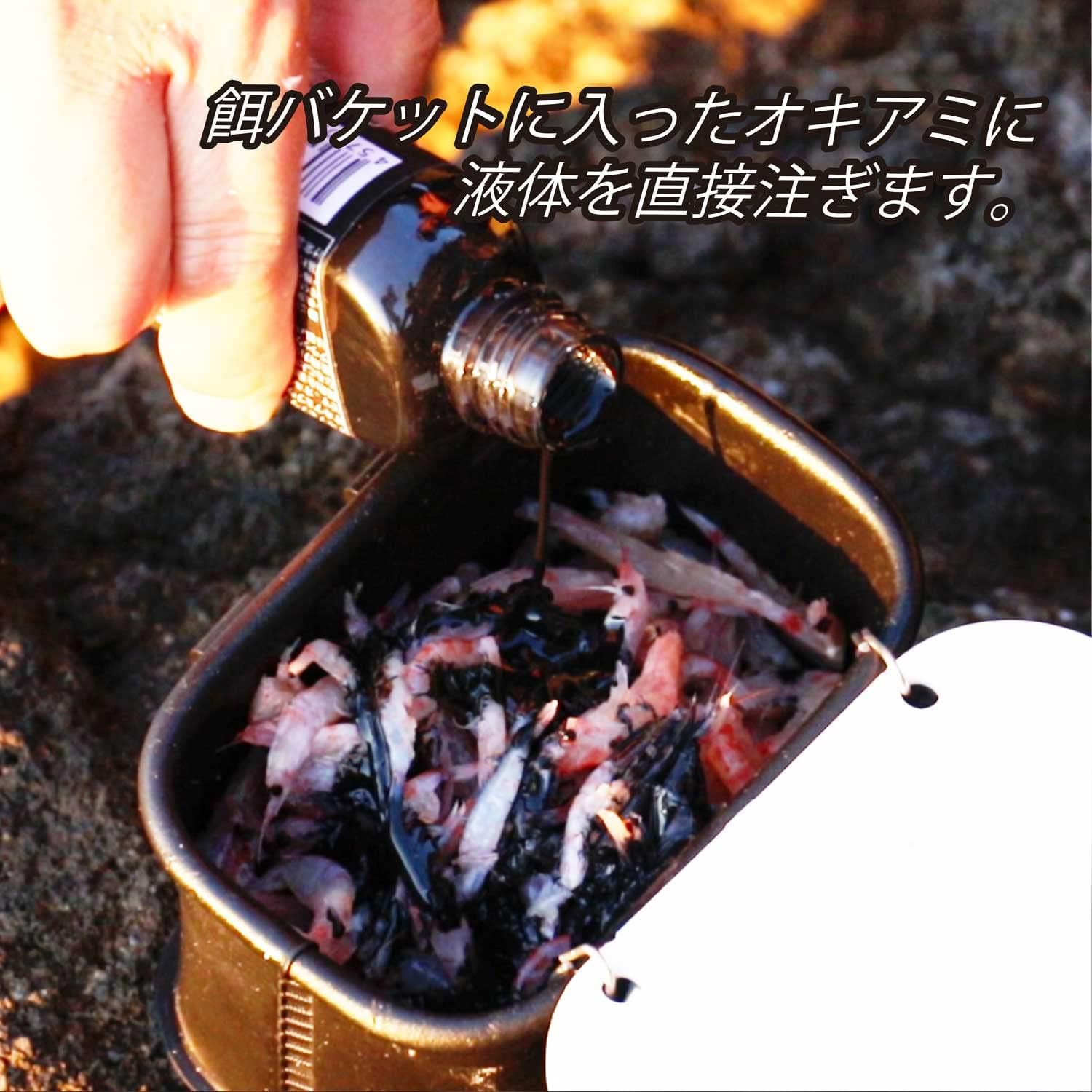 使用方法:解凍したオキアミを餌バケットに入れ、そこにオキアミ全体が浸る程度にオキアミブラックを注ぎます。5~10分程浸すとご使用できます。駅が少ないときは餌バケットを傾けて、バケット内の全体に液が行き渡るようにします。