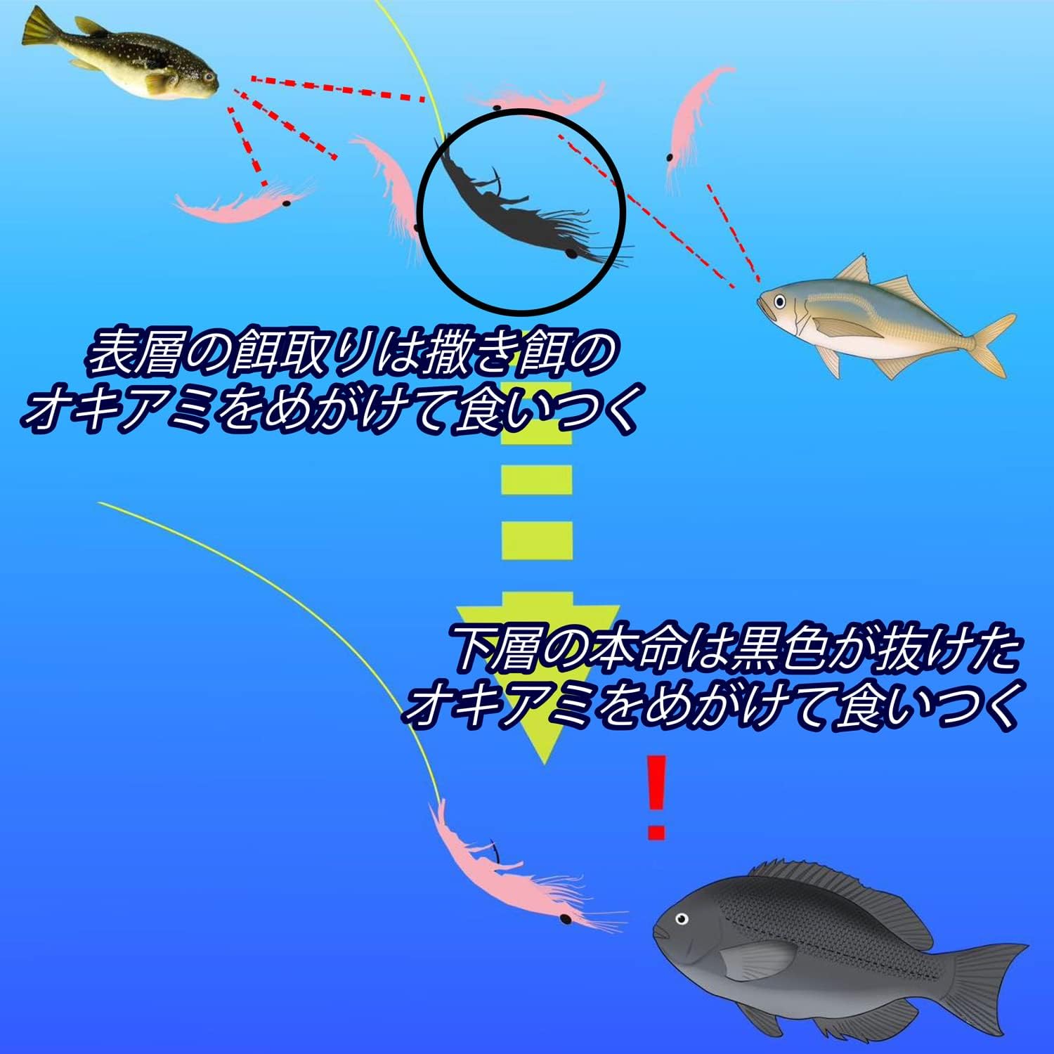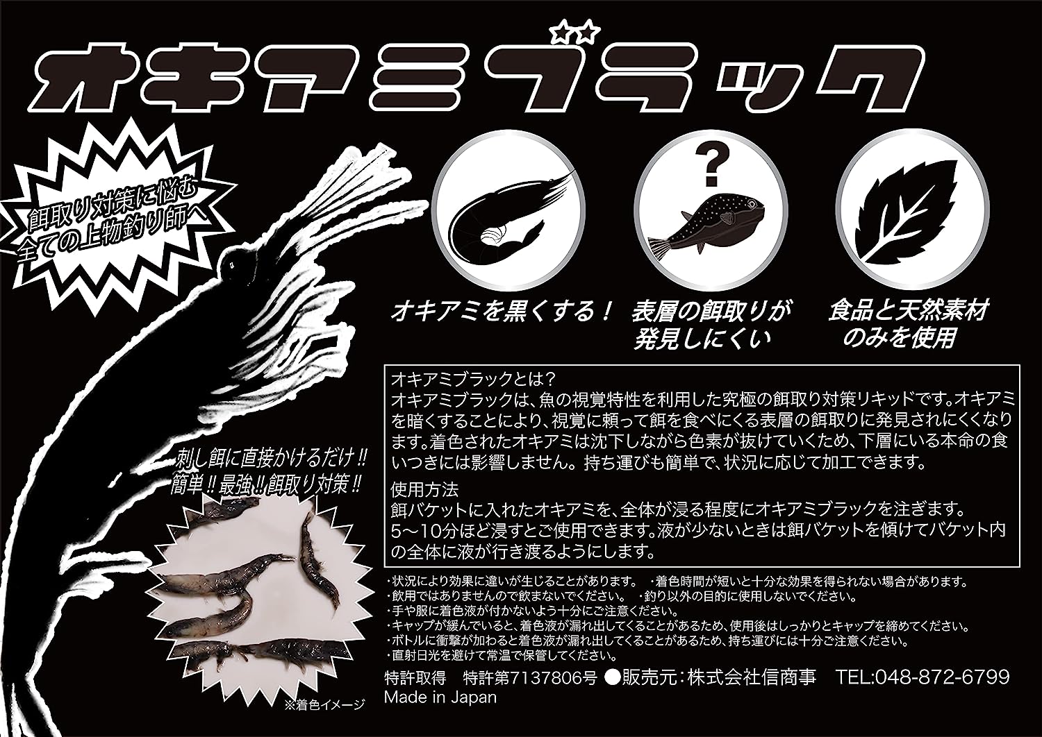 商品説明:オキアミブラックは、魚の視覚特性を利用した究極の餌取り対策リキッドです。オキアミを暗くすることにより、視覚に頼ってエサを食べにくる表層の餌取りに発見されにくくなります。着色されたオキアミは沈下しながら色素が抜けていくため、下層にいる本命の食いつきには影響しません。持ち運びも簡単で、状況に応じて加工できます。